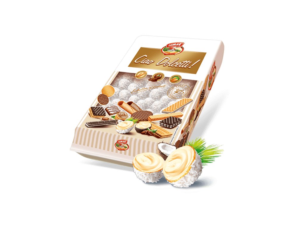 Chutné vaflové kuličky s kokosovou krémovou náplní sypané kokosovými vločkami 400g.
