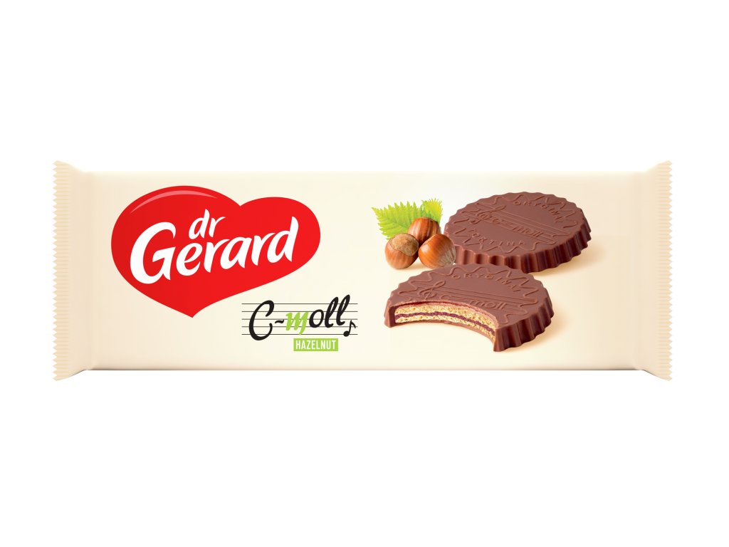 Oplatky máčené v mléčné čokoládě, plněné kakaovou náplní (22,5 %) a náplní z lískových oříšků (19 %) 100g